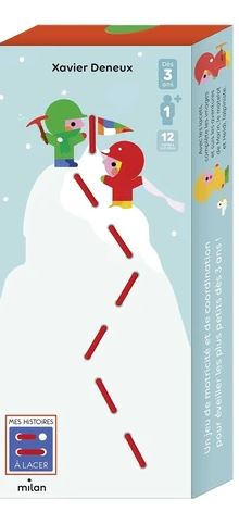 L’enfant insère le lacet dans les trous pour compléter chaque image, puis il pose les cartes les unes à côté des autres afin de découvrir la petite histoire qui s’est créée. Ce jeu permet à l’enfant d’exercer sa patience et sa concentration, et de développer sa motricité : la coordination des mouvements entre l’œil et la main.