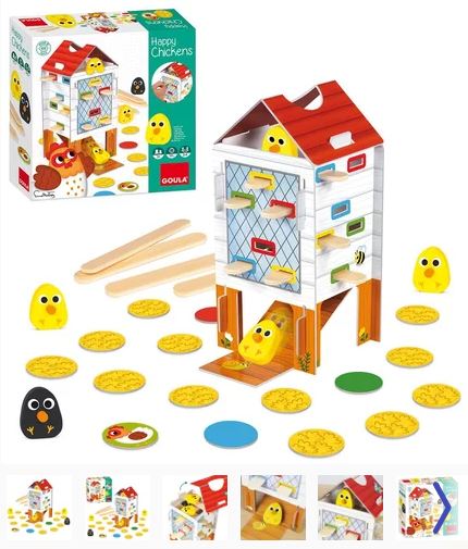 Un jeu compétitif avec deux modes de jeu. Dans le premier mode de jeu, l’enfant doit retirer le bâtonnet en bois qui a la même couleur que les jetons en carton et essayer d’obtenir le plus de poussins possible pour remporter la partie. Dans le second mode de jeu, il suffit de retirer les bâtonnets le plus possible avant que les poussins ne sortent. Mais attention à ne pas faire tomber le poussin noir !