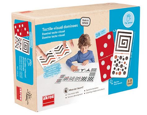Domino tactile de grande taille avec texture rugueuse sur les 2 faces. La première face possède des points rugueux de domino classique et la seconde face des illustrations rugueuses à fort contraste pour jouer aux dominos tactiles. Le jeu est composé de 28 dominos et 15 jetons "récompense". Fait de carton résistant, durable et de haute qualité, ces dominos peuvent être également utilisés pour les personnes ayant une déficience visuelle, enfants et adultes, grâce aux illustrations très contrastées.