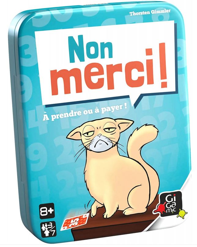 Un jeu de collection qui fait son grand retour avec un matériel de haute qualité sur le principe du stop ou encore. A votre tour de jeu, faites le choix d'accepter une carte ou de dire "non merci!" en posant l'un de vos jetons sur la carte refusée. C'est ensuite au joueur suivant de prendre une décision et éventuellement de récupérer votre jeton. Chaque carte acceptée fait perdre des points. Mais si vous reconstituez les suites, vous ne perdrez que la valeur de la plus petite carte de la suite. Gérez au mieux vos jetons car de toute façon, il vous faudra accepter des cartes.