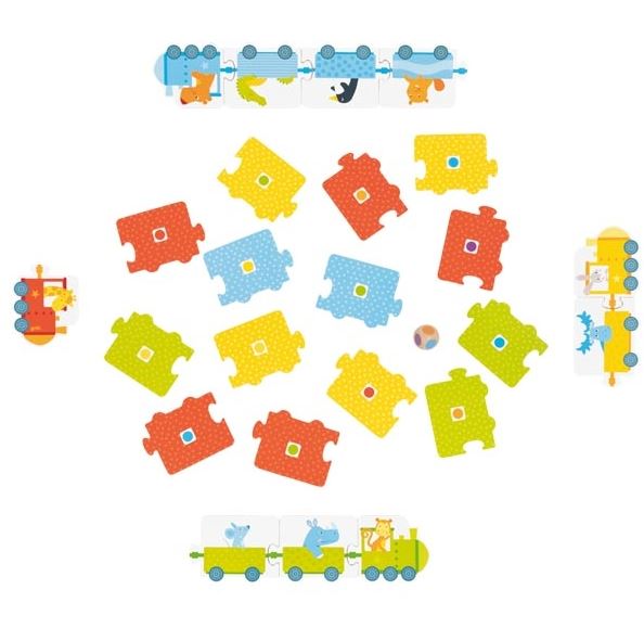 Un jeu de dé avec des couleurs pour reconstituer des trains. On place tous les wagons faces cachées sur la table et chaque joueur choisit une couleur de train. Chaque joueur à son tour jette le dé. Il doit alors prendre un wagon de sa couleur avec la pastille de la couleur du dé. Les trains se construisent petit à petit. La partie s'arrête quand un joueur a complété tout son train. Les plus jeunes peuvent commencer par reconstituer les trains librement. Le jeu est très simple et facilement modulable, avec des grosses pièces adaptées aux jeunes enfants.(didacto.com)