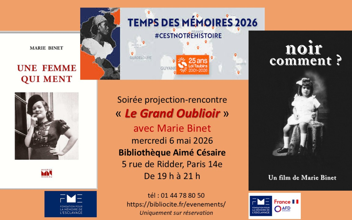 À l’approche de la Journée nationale des mémoires de la traite, de l’esclavage et de leurs abolitions, et du 25ᵉ anniversaire de la loi dite « Taubira » reconnaissant la traite et l’esclavage comme crimes contre l’humanité, la bibliothèque accueille l’écrivaine et réalisatrice Marie Binet.