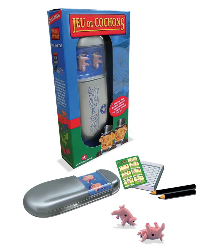 Le Jeu de Cochons est un jeu traditionnel où les joueurs se servent des cochons comme de dés ! Faites rouler les deux amusants petits cochons autant de fois que vous l'osez pour marquer des points lorsque c'est votre tour. Mais si vous forcez la chance et que vous réalisez un "cochon nul" ou un "bon jambon", vous les perdrez tous. Le premier joueur à réaliser un score de 100 points remporte la partie !