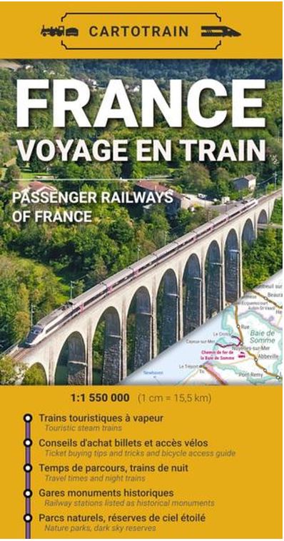 Carte papier dépliable recto verso pour voyager en train en France. Recense tous les services de transport ferrés de voyageurs en France métropolitaine et Corse. Informations et mini-carte train+vélo, guide exhaustif des tarifs TER adaptés au voyage, carte en médaillon des temps de parcours et trains de nuits, services TGV transversaux, trains touristiques, trains à vapeur, patrimoine naturel (parc régionaux et nationaux, forêts d'exception, réserves de ciel étoilé), gares monuments historiques, aperçu de la fréquence de service (lignes et haltes), service autocars et ferrys complémentaires, index des gares. Carte réalisée de manière entièrement indépendante, sur logiciels libres, à partir de données ouvertes.
