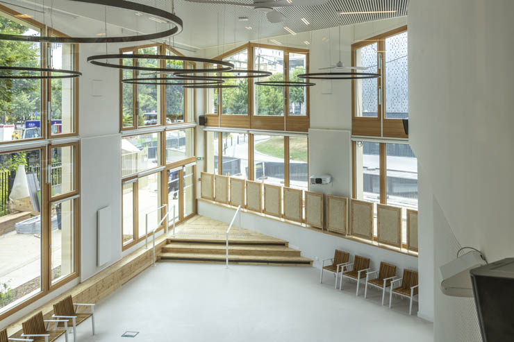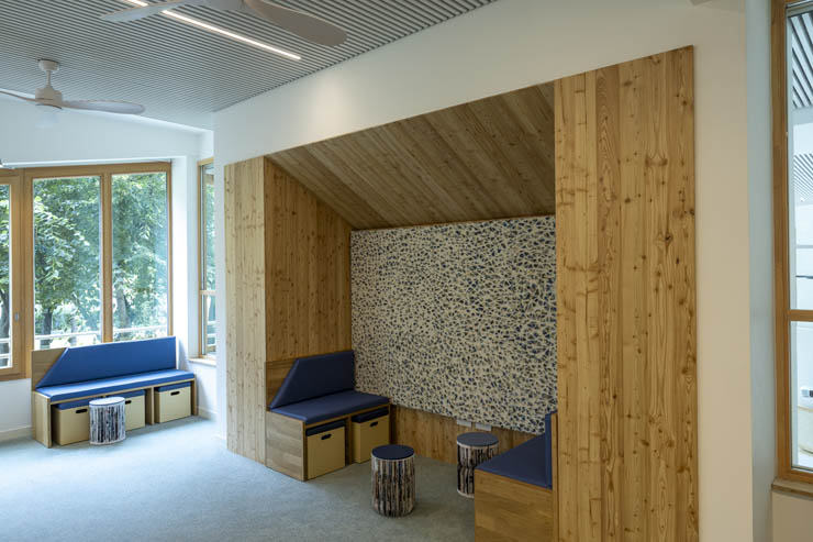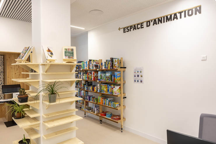 A l’étage, un espace Autoformation et documentation (à partir de 8 ans) et un espace Enfance (0-7 ans) viennent compléter l’équipement. Une cabane à contes de 30m2, accessible aux jeunes enfants, permet de mettre en place des séances de conte et des ateliers. En dehors de ces temps d’animation, les parents pourront disposer d’un endroit agréable avec un mobilier adapté pour s’installer avec leurs enfants.
