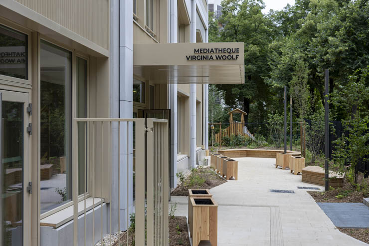 La médiathèque est entourée d’espaces verts : parvis végétalisé menant à l’entrée principale, nouveau jardin Laure Albin Guillot. Ces espaces sont accessibles aux usagers, mais aussi appréciables depuis les larges ouvertures de l’intérieur du bâtiment. Des ateliers participatifs sont prévus, avec les usagers, pour valoriser et sensibiliser à cet environnement très vert. Une grainothèque/bouturothèque est proposée, dès l’ouverture.