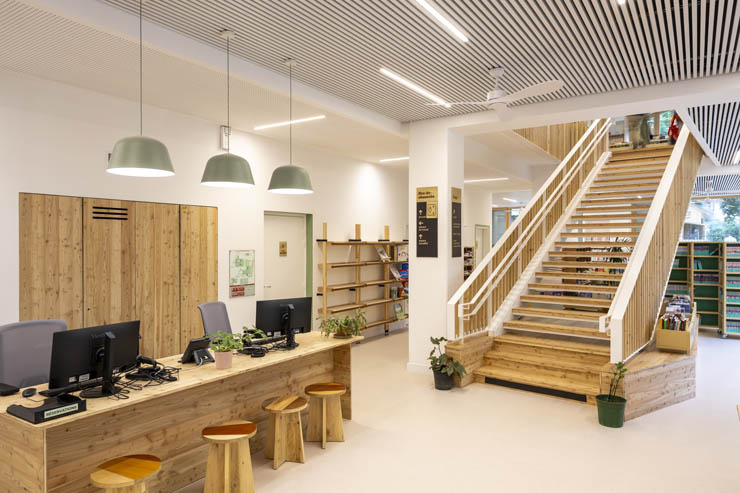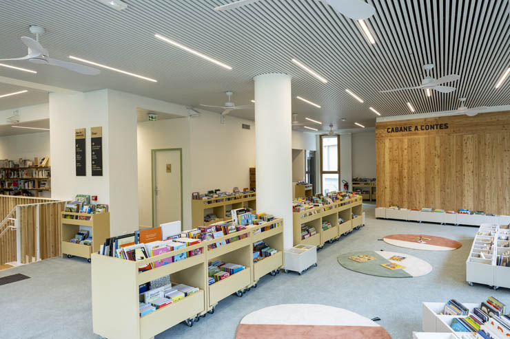 A l’étage, un espace Autoformation et documentation (à partir de 8 ans) et un espace Enfance (0-7 ans) viennent compléter l’équipement. Une cabane à contes de 30m2, accessible aux jeunes enfants, permet de mettre en place des séances de conte et des ateliers. En dehors de ces temps d’animation, les parents pourront disposer d’un endroit agréable avec un mobilier adapté pour s’installer avec leurs enfants.