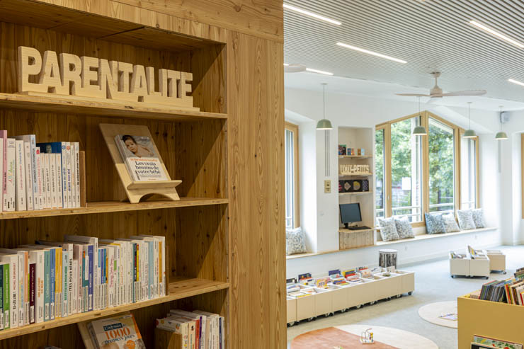 A l’étage, un espace Autoformation et documentation (à partir de 8 ans) et un espace Enfance (0-7 ans) viennent compléter l’équipement. Une cabane à contes de 30m2, accessible aux jeunes enfants, permet de mettre en place des séances de conte et des ateliers. En dehors de ces temps d’animation, les parents pourront disposer d’un endroit agréable avec un mobilier adapté pour s’installer avec leurs enfants.