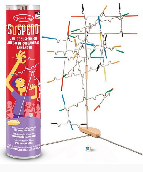 Suspend est un jeu d’équilibre et de dextérité.À chaque tour, une nouvelle pièce est ajoutée à la sculpture verticale en constante transformation, ce qui provoque un ajustement de l’équilibre et hausse le niveau de difficulté. Suspend mettra vos nerfs à rude épreuve ! Il va falloir trouver votre équilibre ! Tirez au sort à l’aide d’un dé la pièce à placer (une baguette métallique plus ou moins longue avec de une à cinq encoches pour s’accrocher). Reste alors à la placer sur le mobile constitué des pièces déjà suspendues mais sans les faire tomber ! Vous récupérez les pièces que vous faites choir : le premier qui n’a plus de baguettes à mettre ni dans sa réserve ni dans la réserve commune a gagné.