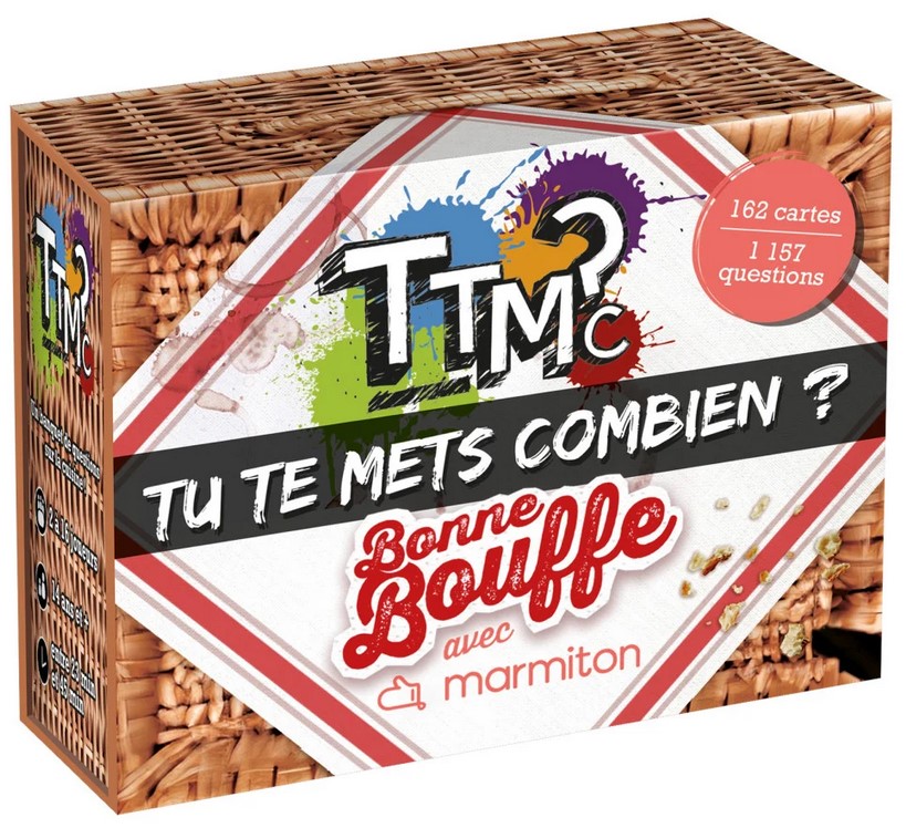 Le but de TTMC - Tu Te Mets Combien ? - Bonne Bouffe est d’être le premier à parcourir le plateau en répondant aux questions posées. À chaque note correspond une question, plus ou moins complexe : plus la note choisie est élevée, plus la question est pointue. En cas de bonne réponse, l'équipe avancera du nombre de cases correspondant à sa note auto-évaluée. Par exemple si tu réponds juste à une question 6, tu avanceras de 6 cases. C'est drôle, accessible à tous les amoureux de cuisine et il y a de quoi faire : 162 cartes et 1157 questions, avec la présence de cartes originales pour pimenter la partie.