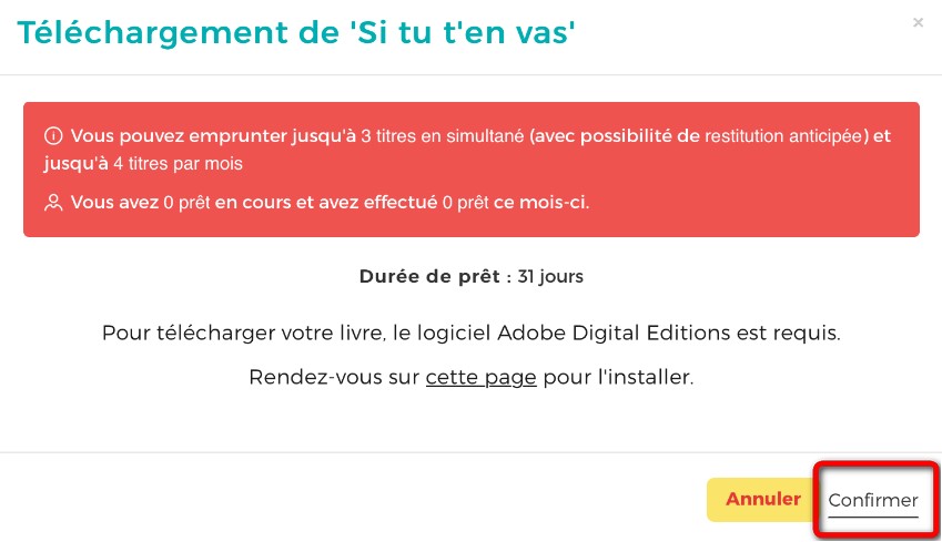 Une fenêtre indique l’état de votre compte. Si vous n’avez pas atteint votre quota de prêt (3 prêts simultanés, 4 prêts maximum par mois), appuyez sur Confirmer.