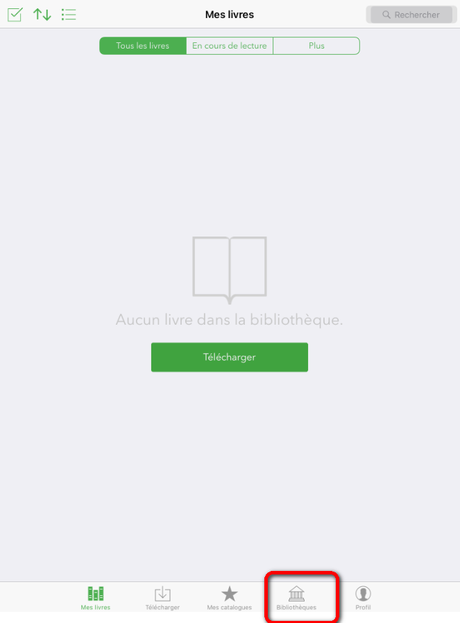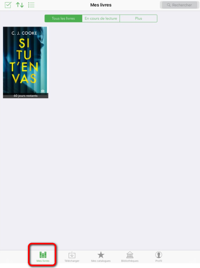 Le livre est automatiquement téléchargé dans l'application Aldiko. Cliquez sur l'onglet Mes livres en bas à gauche pour le retrouver.