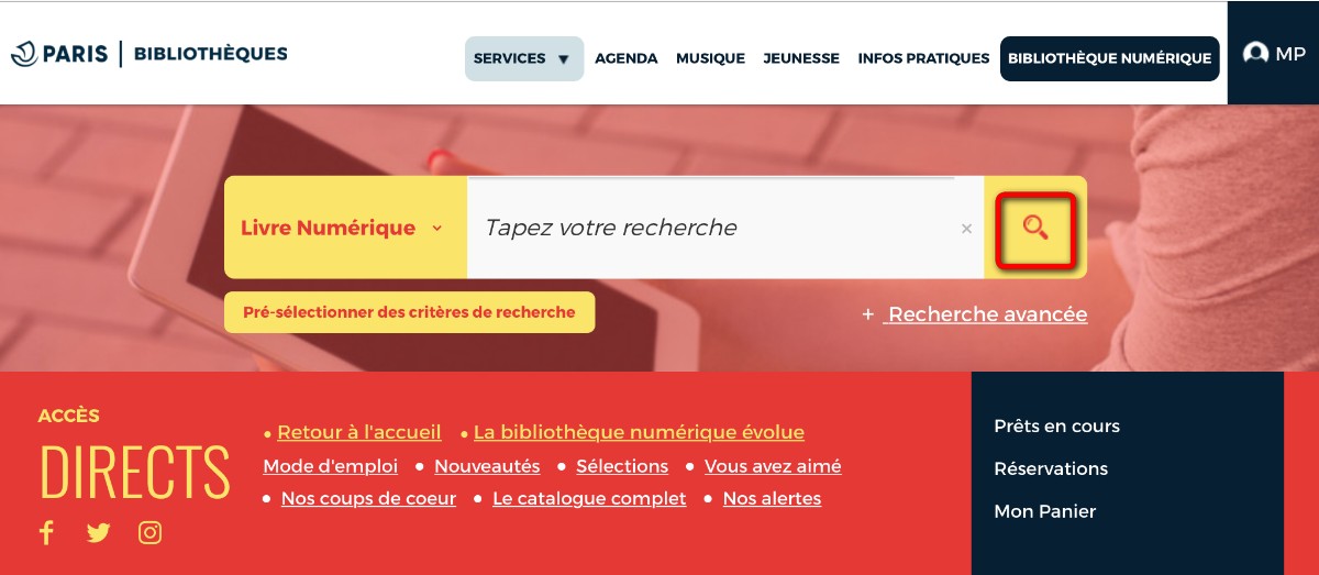 Appuyez sur le nouveau bandeau central Bibliothèques de prêt de la Ville de Paris.
