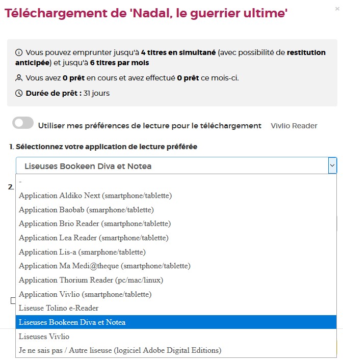 Première étape, choisissez votre appareil ou votre application de lecture. Choisissez Liseuses Bookeen Diva et Notea.