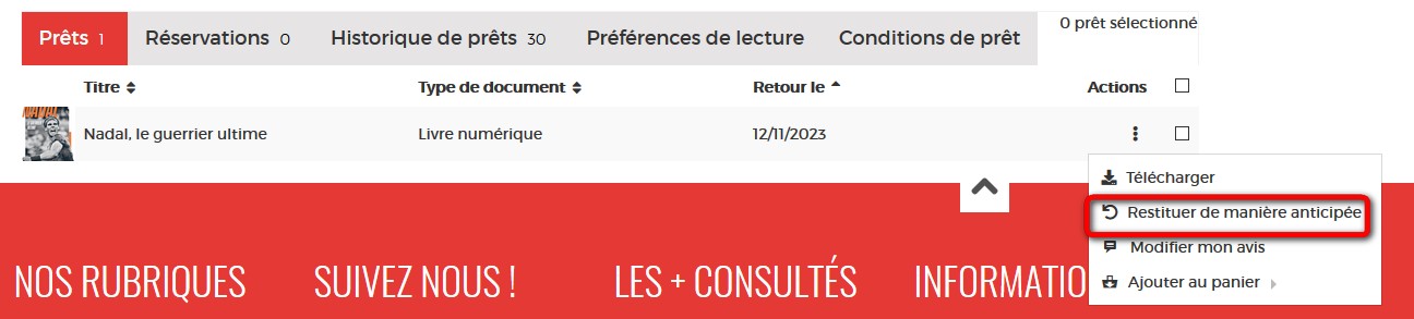 Dans l’onglet Prêts, vous verrez apparaître le ou les ouvrage(s) emprunté(s). Cliquez sur l'icône sur la ligne du livre concerné.