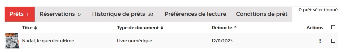 Dans l’onglet Prêts, vous verrez apparaître le ou les ouvrage(s) emprunté(s). Cliquez sur l'icône sur la ligne du livre concerné.