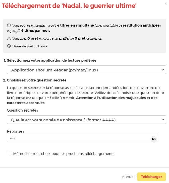 Vous pouvez cocher l’icône de l’œil à droite de votre réponse pour vérifier que vous avez bien tapé votre date de naissance. N’hésitez pas à cocher Mémoriser mes choix pour les prochains téléchargements afin de ne plus avoir à remplir le formulaire les prochaines fois. Vous pourrez le modifier par la suite si vous changez d’appareil ou d’application de lecture dans votre compte usager.