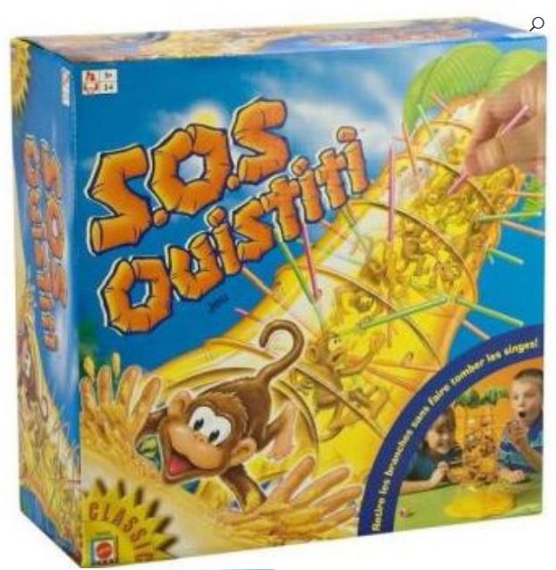 Dans Sos Ouistiti de Mattel, les règles sont simples : Vous lancez le dé et retirez une baguette correspondant à la couleur indiquée par le dé ! Mais attention aux ouistiti, le joueur qui gagne est cleui qui en aura fait tomber le moins !
