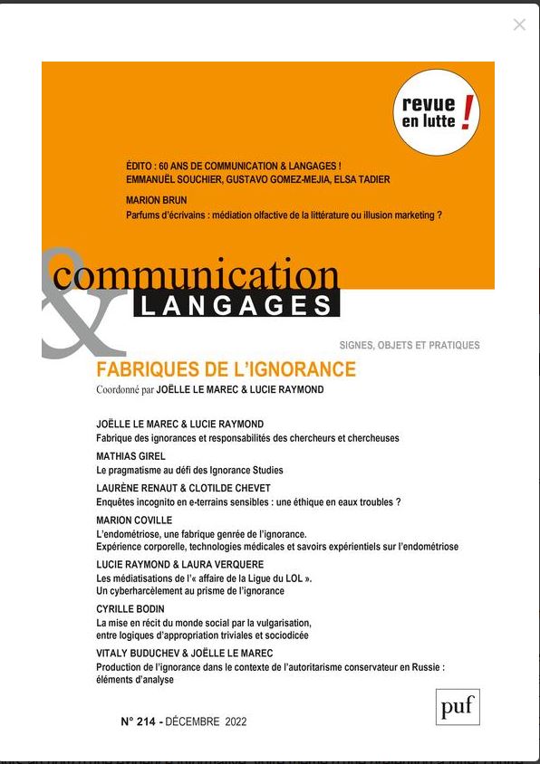 Si la thématique des "fabriques de l'ignorance" touche de nombreux domaines, ce dossier est centré sur les pratiques actuelles de la recherche ainsi que sur les formes et les dynamiques communicationnelles et médiatiques qui conditionnent la visibilité de certains savoirs dans nos sociétés contemporaines. Comment nos propres pratiques de recherche sont-elles parfois prises dans les points aveugles des objets ou des phénomènes qu'elles tentent d'observer ou de comprendre ? Et comment la médiatisation de controverses scientifiques ou politiques et sociales participe-t-elle à un effacement de certains enjeux, de certains savoirs, alors même que les médias produisent et mettent en circulation des discours au nom d'une exigence informative, voire même d'une prétention à lutter contre l'ignorance ?