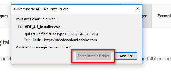 - Sous Chrome, choisissez un emplacement pour enregistrer le fichier, puis cliquez sur Enregistrer. Une fois le téléchargement terminé, cliquez sur ADE_4.5_Installer.exe dans la barre de téléchargement en bas de la page.