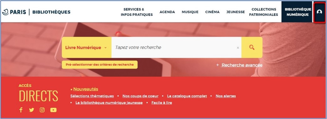 Allez sur le site de la bibliothèque numérique de Paris et connectez-vous en cliquant sur l’icône en haut à droite.