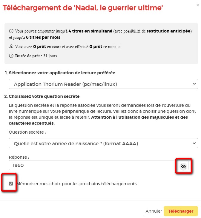 Vous pouvez cocher l’icône de l’œil à droite de votre réponse pour vérifier que vous avez bien tapé votre date de naissance. N’hésitez pas à cocher Mémoriser mes choix pour les prochains téléchargements afin de ne plus avoir à remplir le formulaire les prochaines fois. Vous pourrez le modifier par la suite si vous changez d’appareil ou d’application de lecture dans votre compte usager.