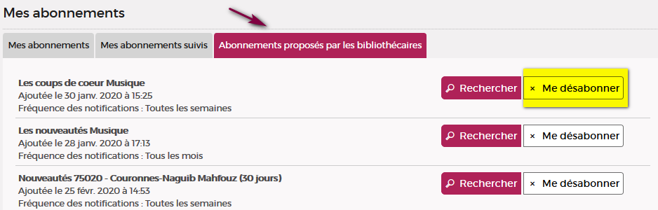 - Connectez-vous à votre compte lecteur, puis allez dans la rubrique "Mes abonnements" de votre compte. En regard de l'alerte concernée, cliquez sur "Me désabonner".