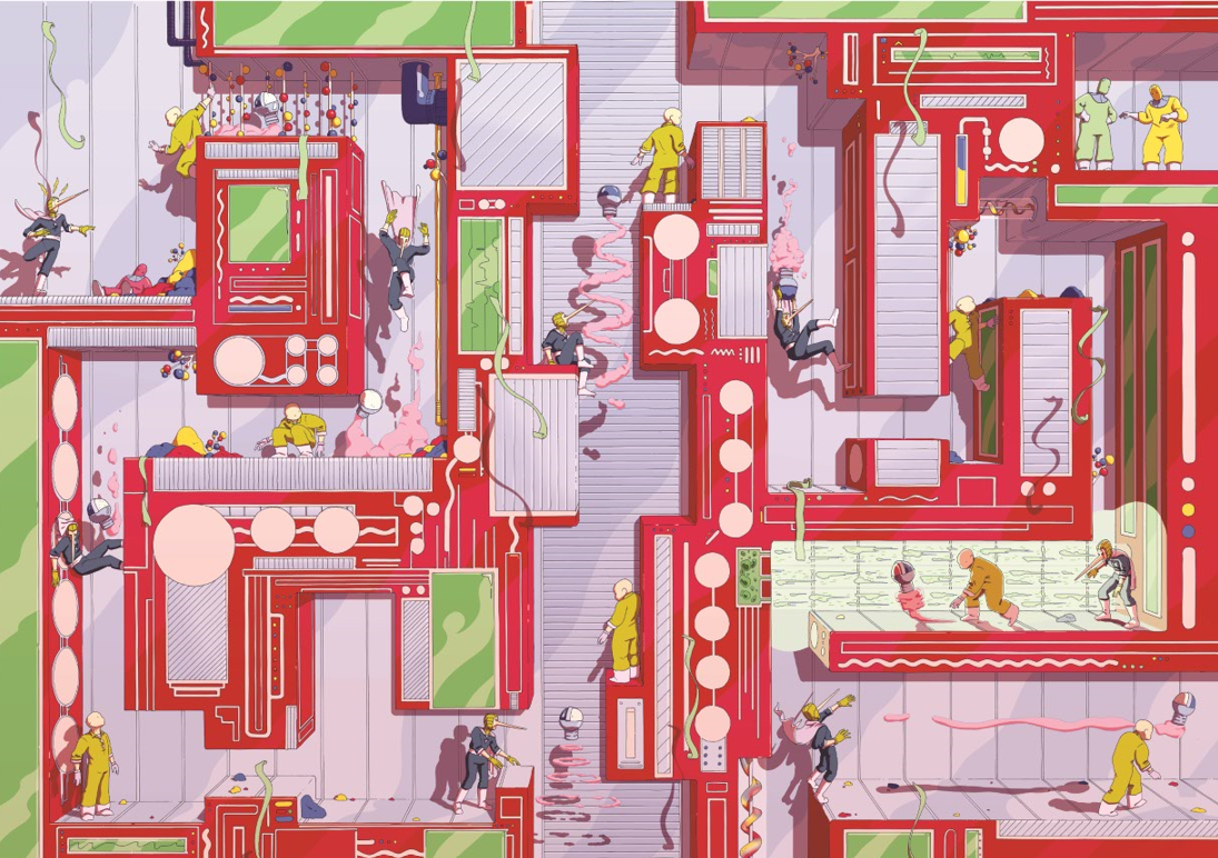 Invité à la bibliothèque Vaclav Havel dans le cadre du festival Les Mycéliades, l’illustrateur Jean Dalin revient sur la construction de ses décors monumentaux, ses influences et les projets singuliers qui nourrissent son travail